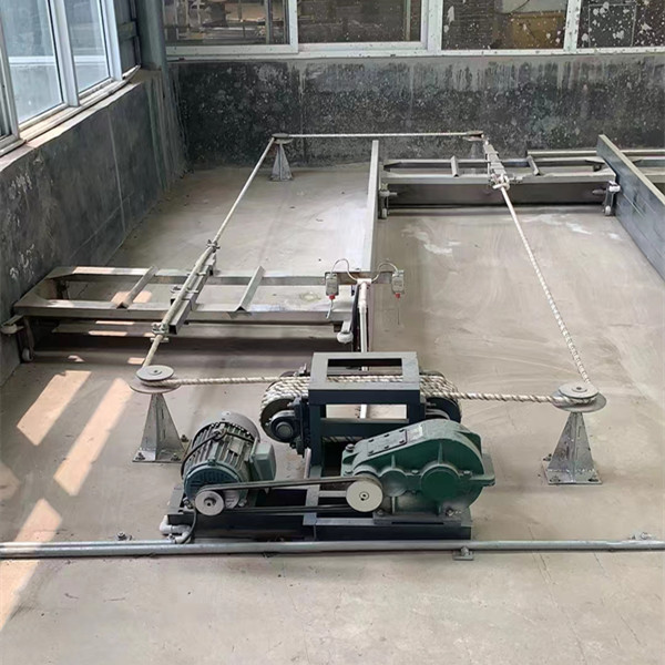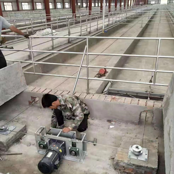 減速機(jī)輸出軸通過鏈條或者三角皮帶,將動(dòng)力傳到主驅(qū)動(dòng)輪上,驅(qū)動(dòng)輪和牽引繩張緊后的摩擦力做牽引,帶動(dòng)刮板往返運(yùn)動(dòng),刮板工作時(shí),由刮板上月牙滑塊擦地自動(dòng)落下,返回時(shí)自動(dòng)抬起,完成清糞作業(yè)。